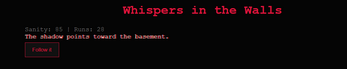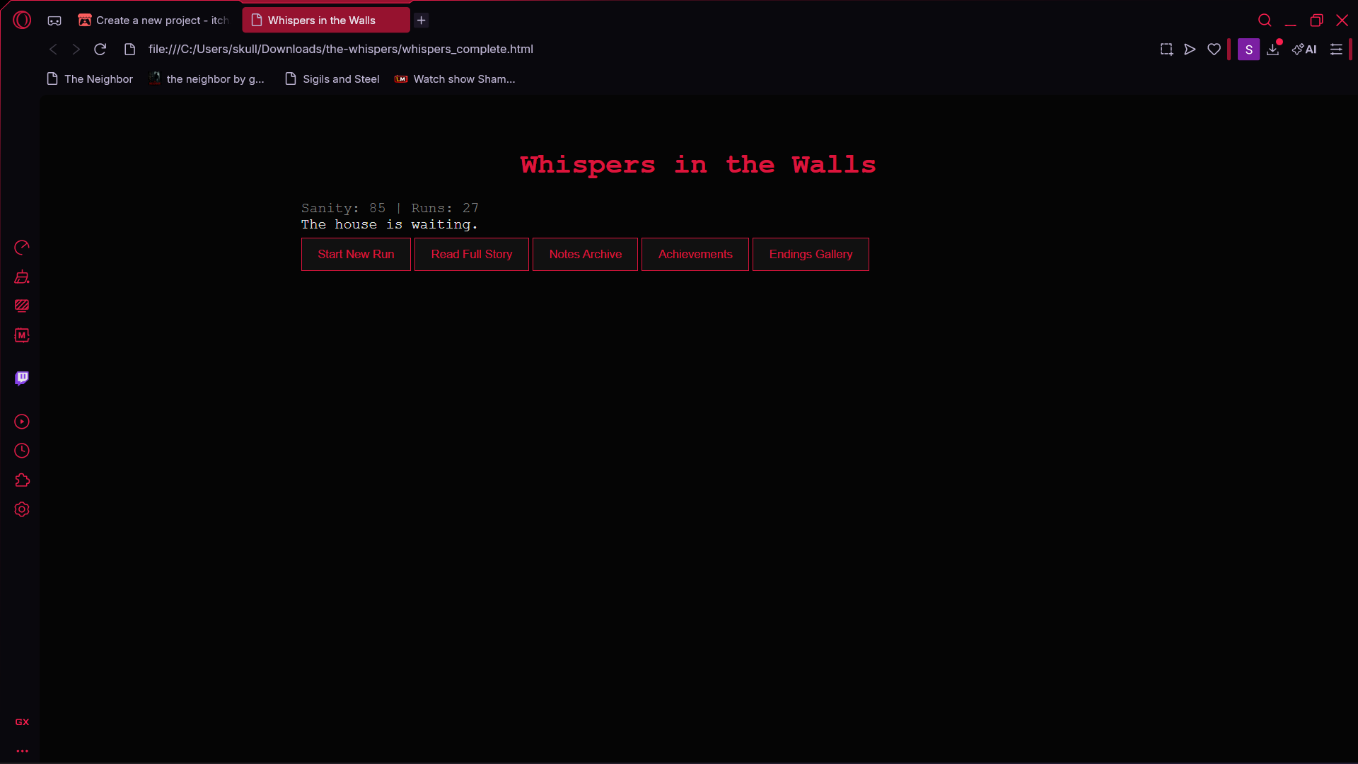 this is a small horror project I've been working on, its about Elias, and he thinks has moving into the right house finally, when everything goes wrong, will he survive? or will he never be seen again? play through the story yourself! experience different endings, collect notes or achievements.